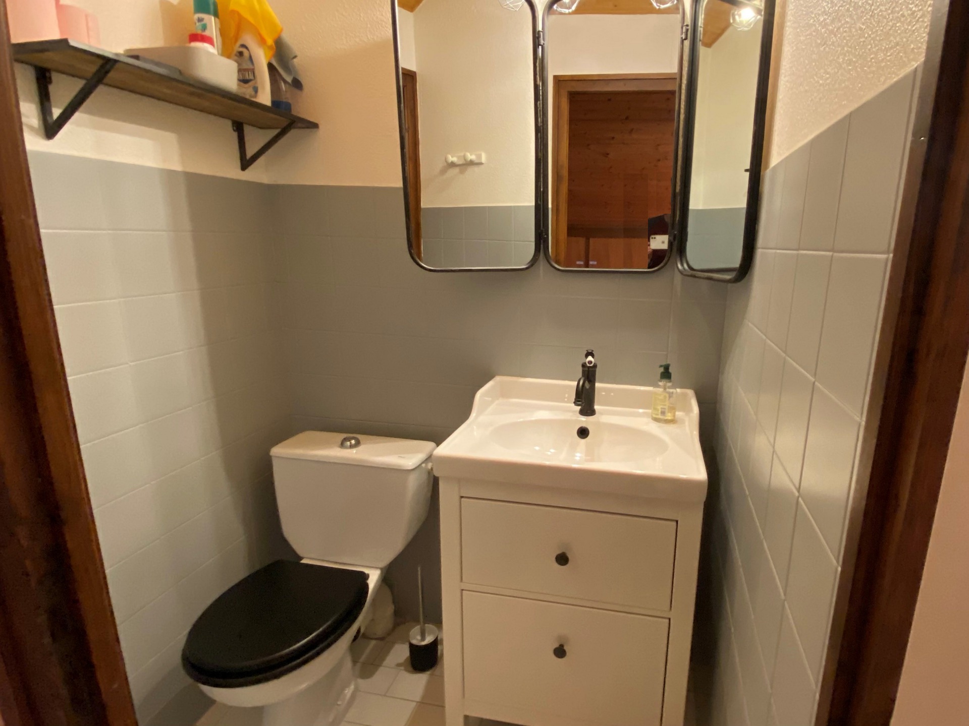 Etage superieur : Mezzanine salon : Canape convertible, placard, velux - Chambre : Lit, armoire, fenetre nord vue batiment - Cabinet de toilette : Lavabo et wc