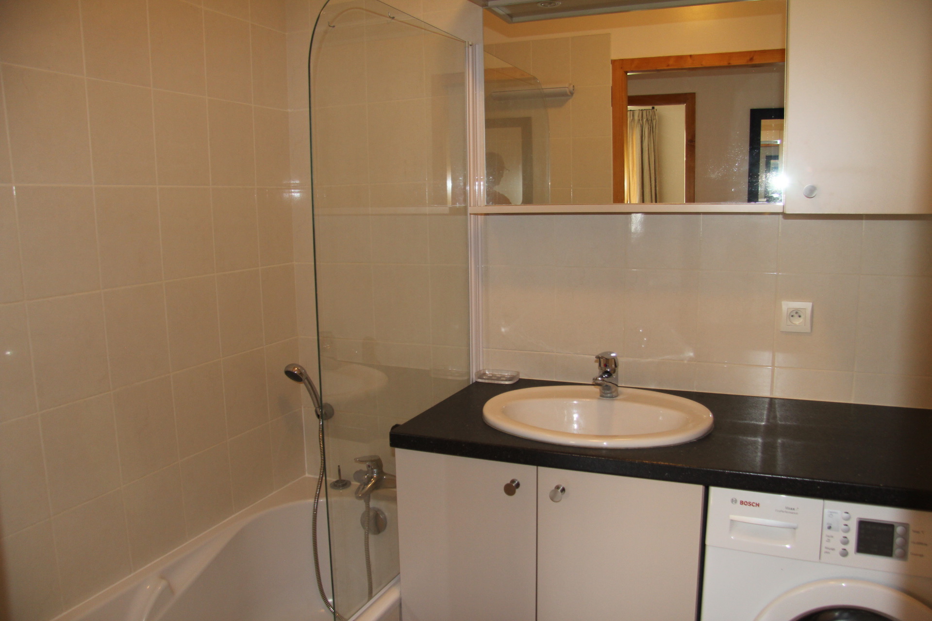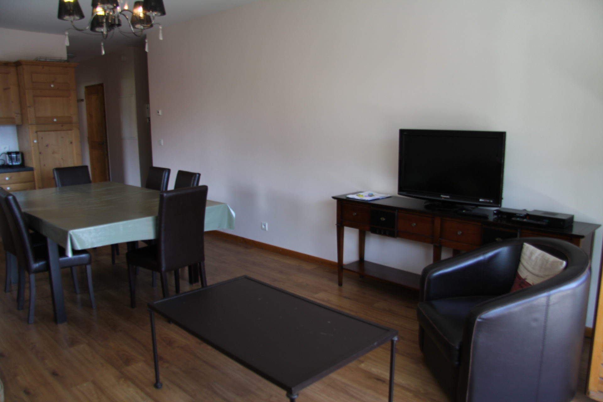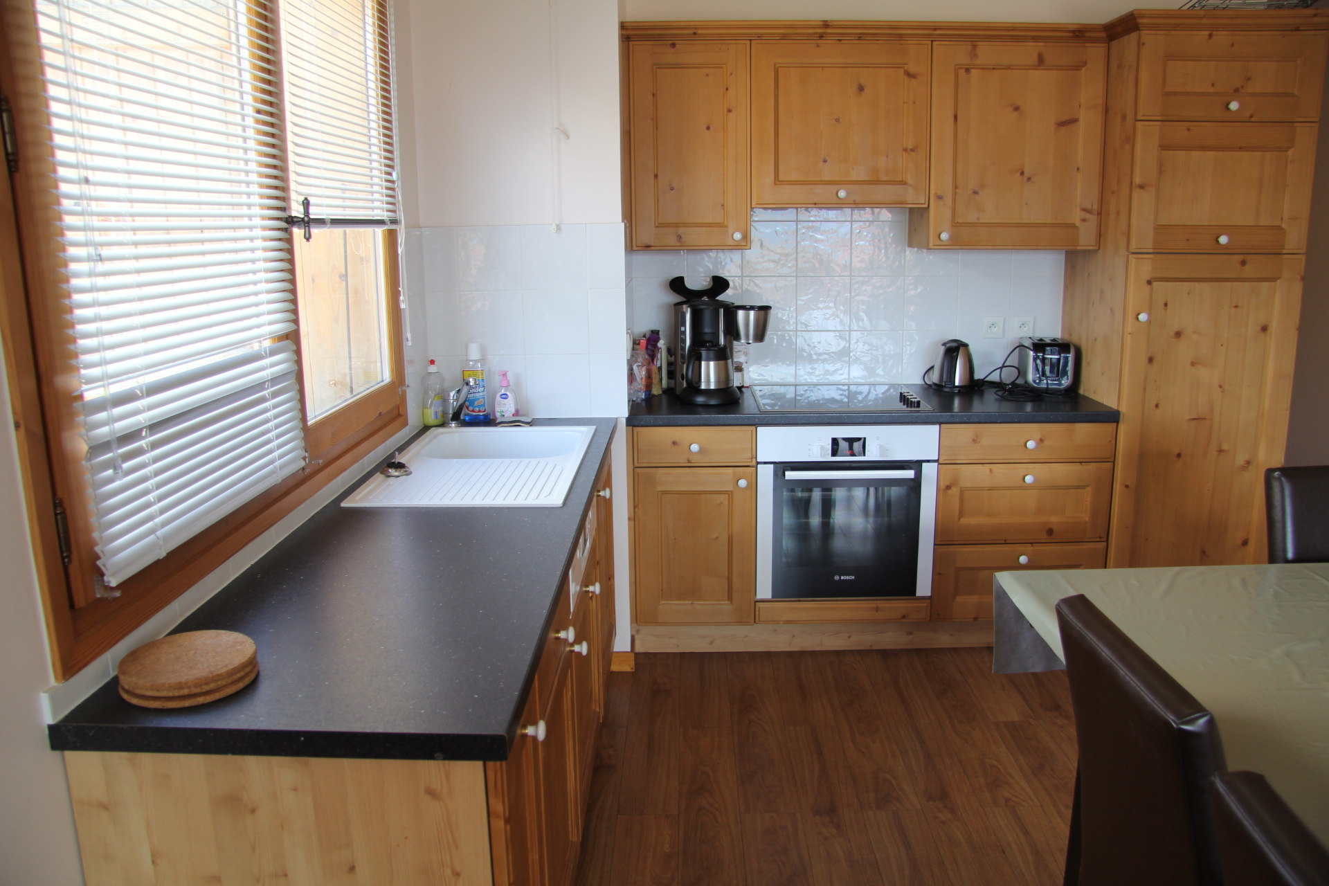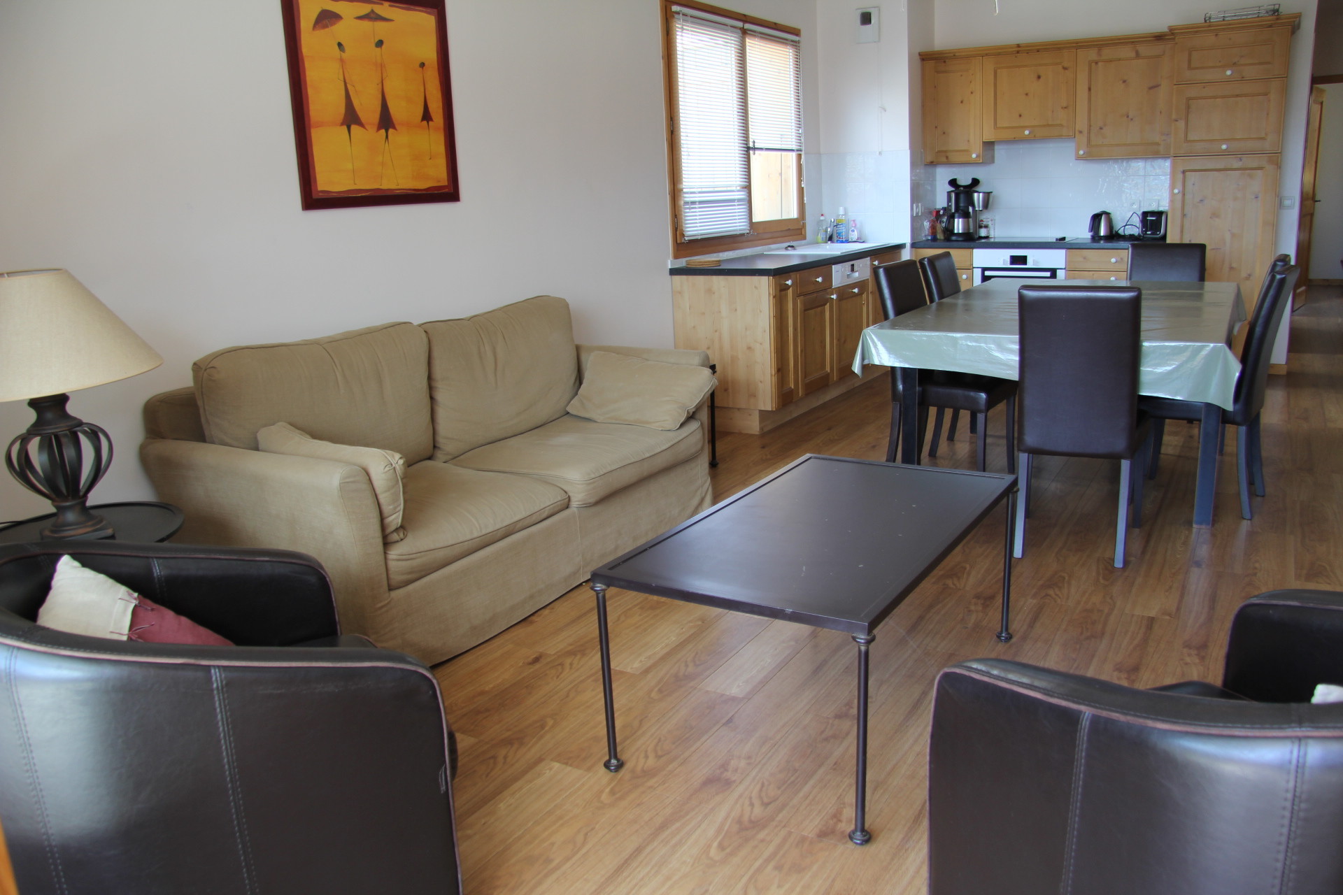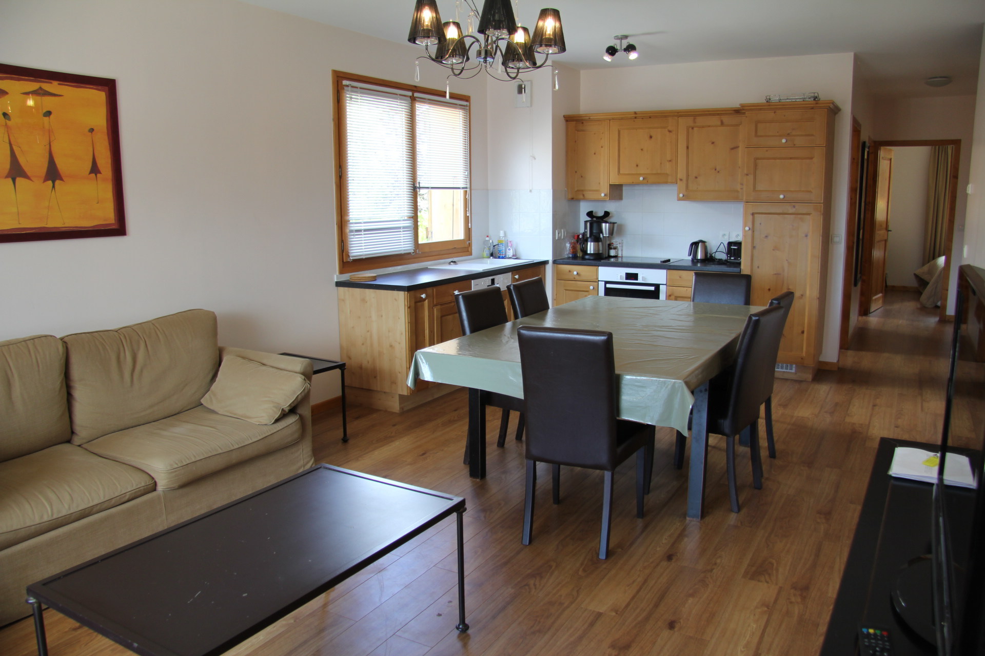 Residence recente de 10 appartements livree en 2008 - Entree hall avec placard penderie - WC independants avec placards - Salle de bains (5.51m2) : Baignoire, lavabo, meuble vasque avec miroir, placards, lave-linge, radiateur seche-serviettes - Chambre 1 (11.53m2) : Lit, penderie, fenetre nord - Chambre 2 (8.15m2) : Lit, commode, fenetre est - Coin Cabine (6.34m2): Lits, fenetre nord, commode - Sejour (27m2) avec coin cuisine equipee (4 plaques vitro-ceramiques, lave-vaisselle, refrigerateur, four, micro-ondes, cafetiere electrique a filtre, grille-pain, bouilloire, appareil a raclette, coin repas avec table, chaises, coin salon avec canape, fauteuil, TV, baie acces balcon ouest