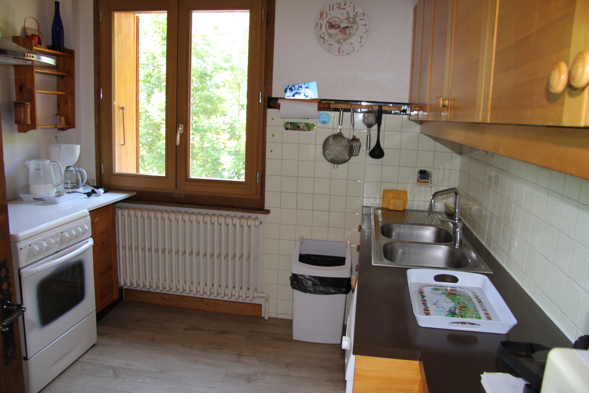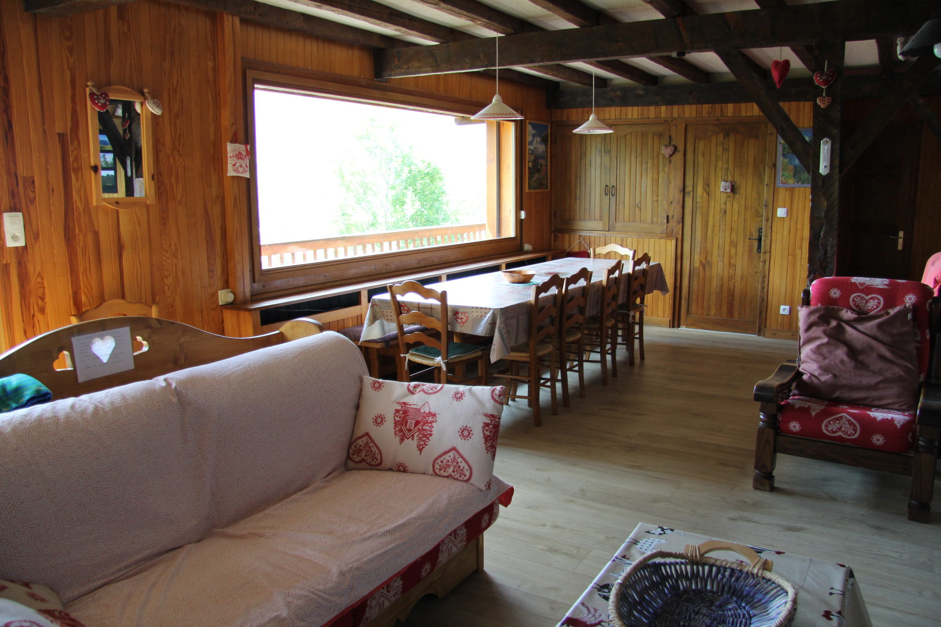 ETAGE PRINCIPAL : Sejour (25 m2) avec Coin repas : Table et chaises pour 10 personnes - Coin salon : Fauteuils, banquette, television, baie vitree acces a la terrasse sud et balcon ouest - Cuisine independante (7.50m2) : Refrigerateur, cuisiniere 3 plaques gaz + 1 electrique, four, lave-vaisselle,micro-ondes, evier double, fenetre nord vue acces chalet - SdEau : Douche, lavabo, fenetre - wc independant - Exterieur avec acces terrasse terrain