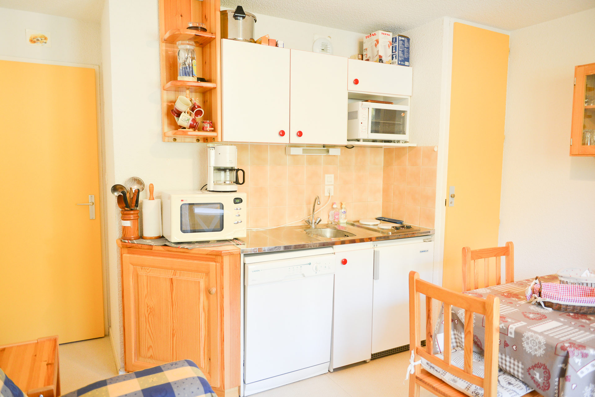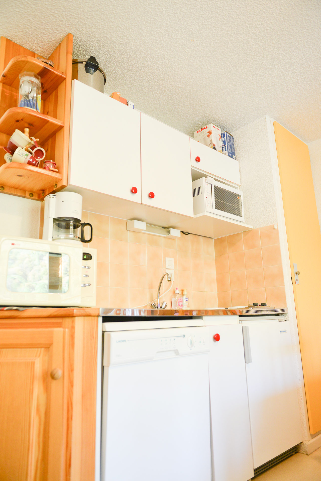 Coin cuisine : four, micro-ondes, réfrigérateur, plaque électrique (2 foyers), lave-vaisselle.