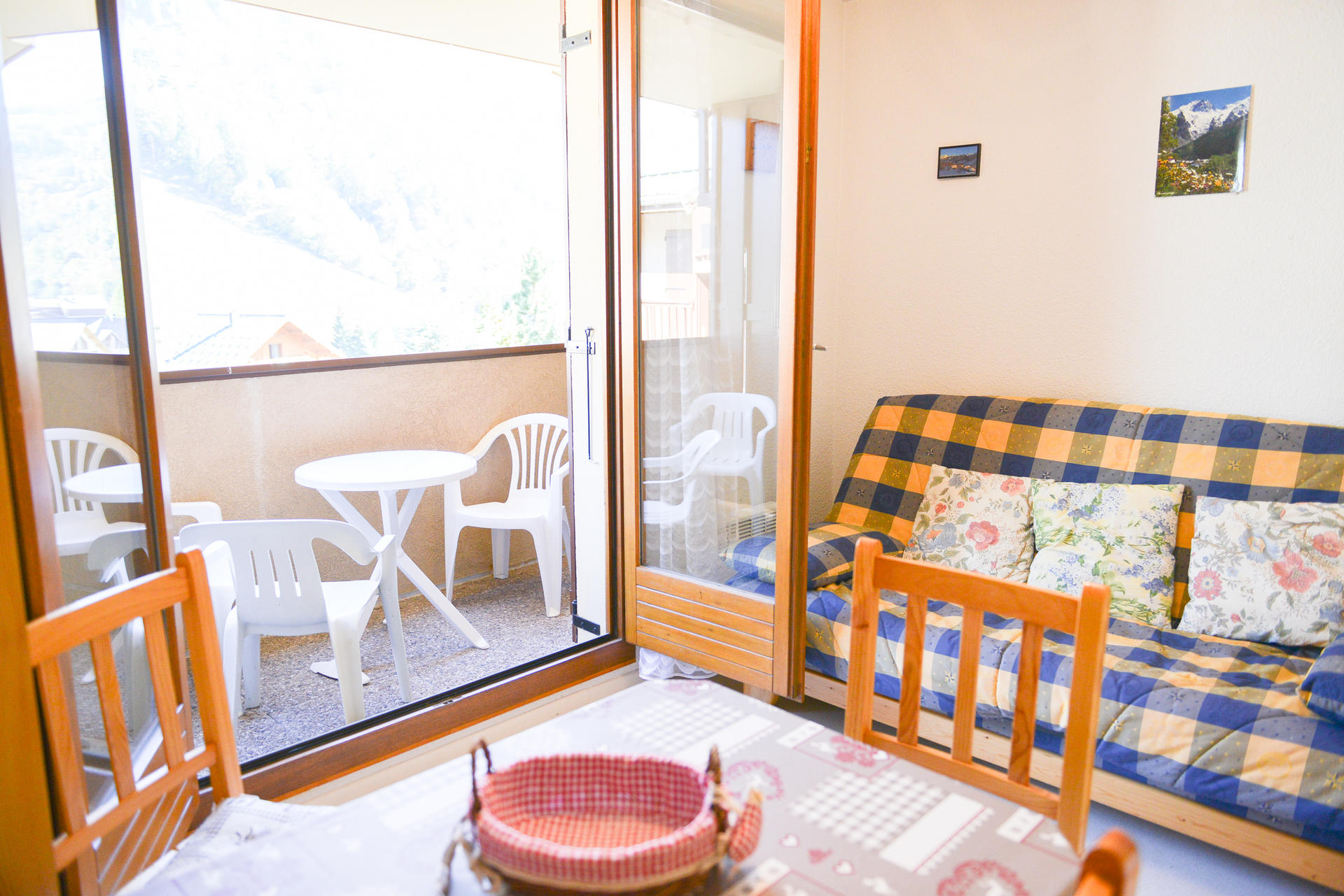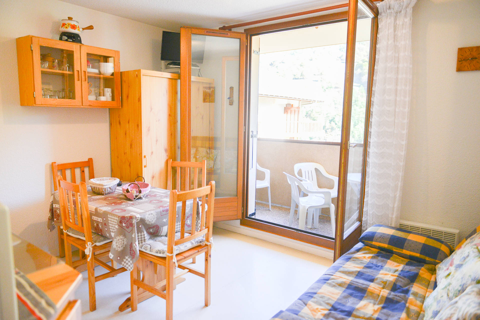 Balcon (Est) avec 1 table et 4 chaises. Parking collectif non privatif.